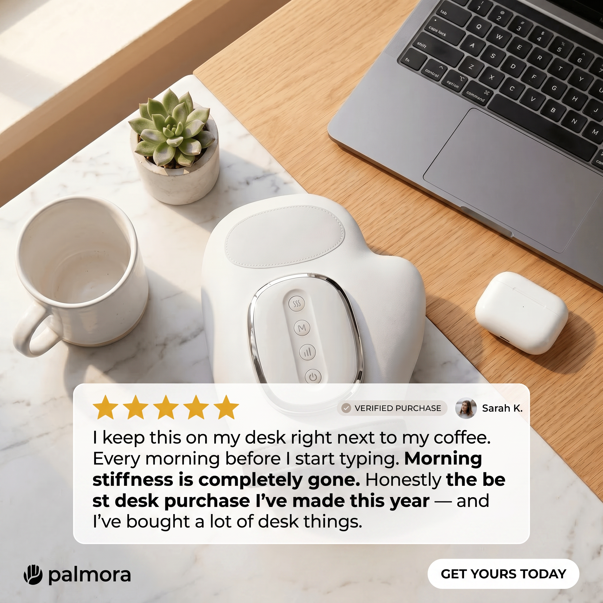 Palmora isn't a medical device and won't cure carpal tunnel syndrome. But the combination of infrared heat and air compression relieves the compression symptoms — tingling, numbness, and wrist tightness — by improving circulation and relaxing the surrounding tendons. Most users with mild-to-moderate symptoms report significant relief within the first 5–7 days of daily use.